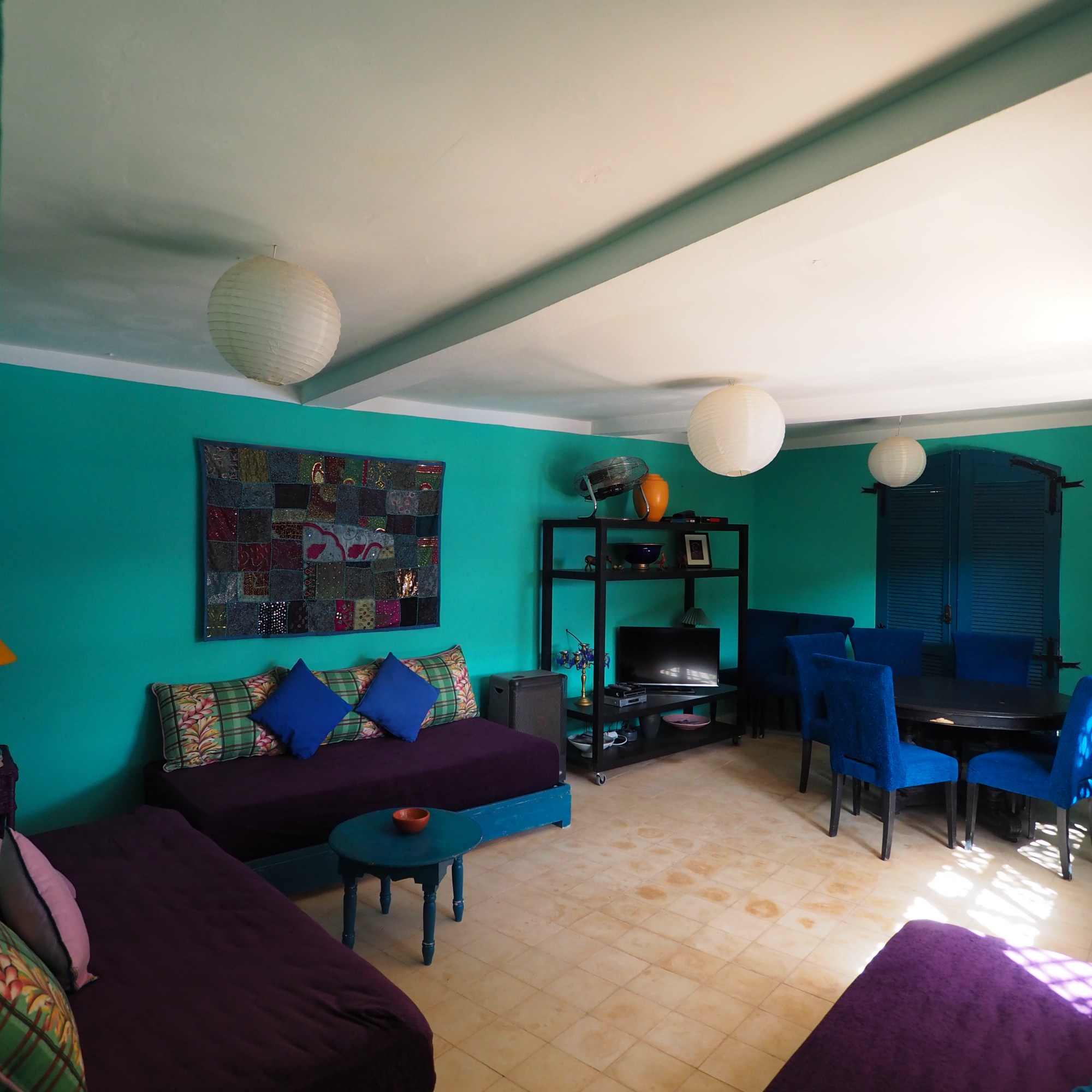 La partie « salon » offre un grand espace « Détente » avec 3 canapés -, une télé avec lecteur DVD.
